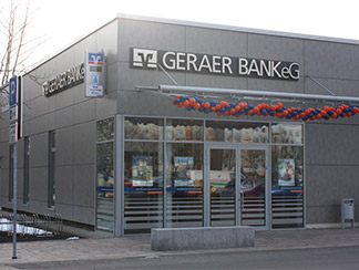 >> Der Neubau der Geraer Bank in Gera-Lusan erstrahlt in klassischem Chic.